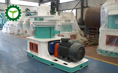 工作时生物质木屑原料由进料口垂直落入,经过压轮的旋转使物料连续均布在模具内腔表面(压辊与模具的接触立面),在压辊的碾压下粉状物料穿过模具的孔(均布在模具内表面的孔)。此过程物料受到高压、高温的作用,产生物理变化或适当的化学变化(根据物料),促使粉状物料形成不断加长的圆柱状实心体,再由断刀切断颗粒,从出料口排出,至此颗粒的压制过程完成。