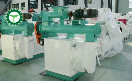 工作时生物质木屑原料由进料口垂直落入,经过压轮的旋转使物料连续均布在模具内腔表面(压辊与模具的接触立面),在压辊的碾压下粉状物料穿过模具的孔(均布在模具内表面的孔)。此过程物料受到高压、高温的作用,产生物理变化或适当的化学变化(根据物料),促使粉状物料形成不断加长的圆柱状实心体,再由断刀切断颗粒,从出料口排出,至此颗粒的压制过程完成。
